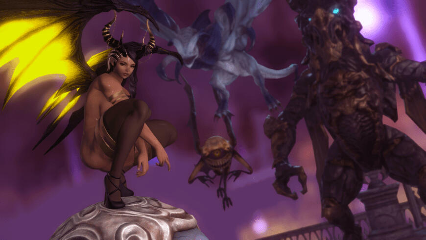 Kay was sucked in When her feet touched solid ground, she staggered, disoriented. Kay realized she was no longer in the Hells. She stood in the heart of Uldah, A bustling city-state of Eorzea. The locals eyed her with curiosity. Kay’s wings and horns, drew gasps and whispers. Kay’s presence did not go unnoticed. The Immortal Flames, Uldah’s military order, questioned her origins. They eyed her wings, Was she of a voidsent? Kay evaded their scrutiny, slipping into the Quicksand a tavern. Where is took the form of a Viera.